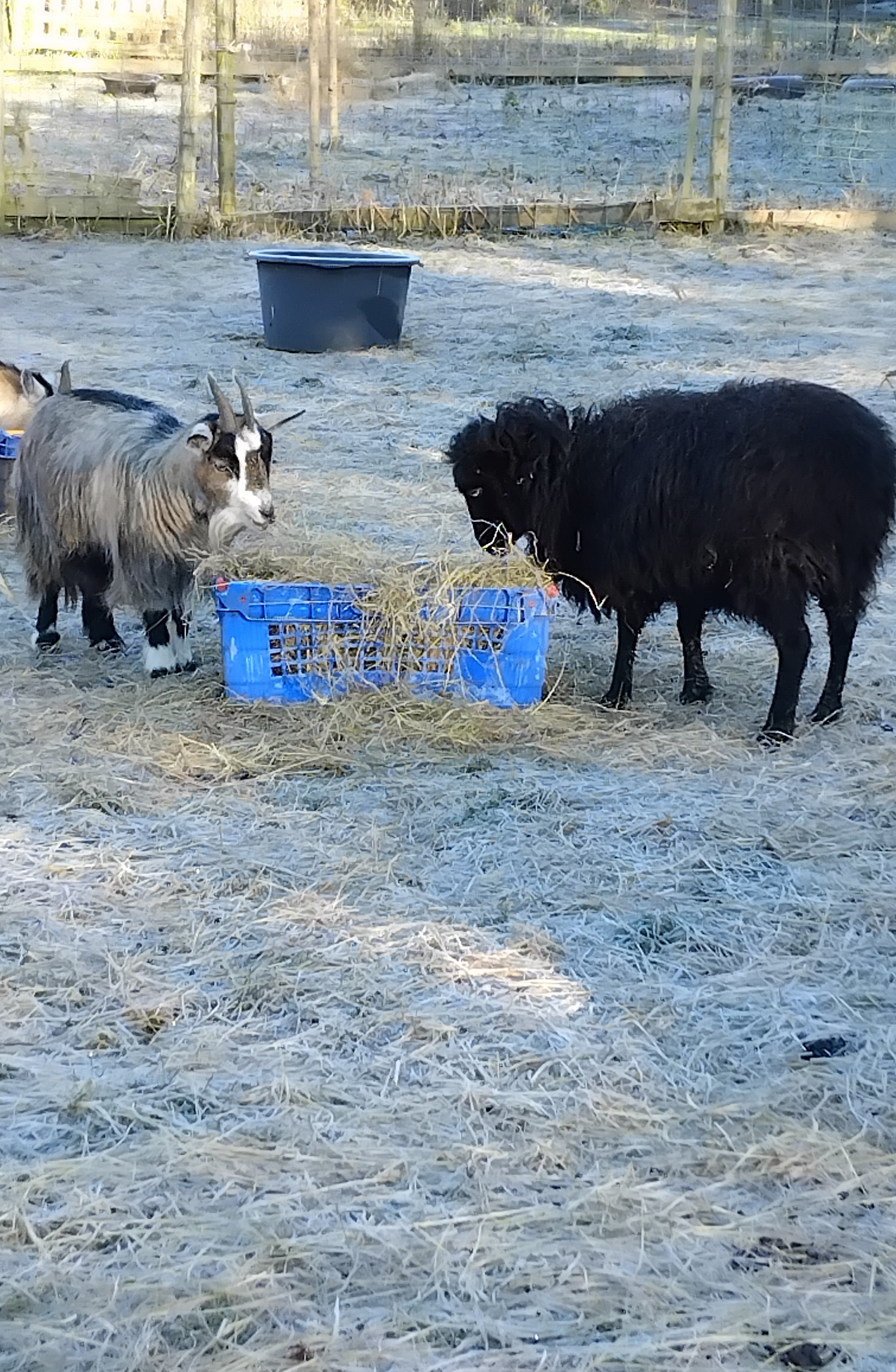 This was the first snow that Winston, our very handsome ram and his little buddy Humphrey, had ever seen. Even Pumpkin the cat enjoyed a good roll in the white stuff.